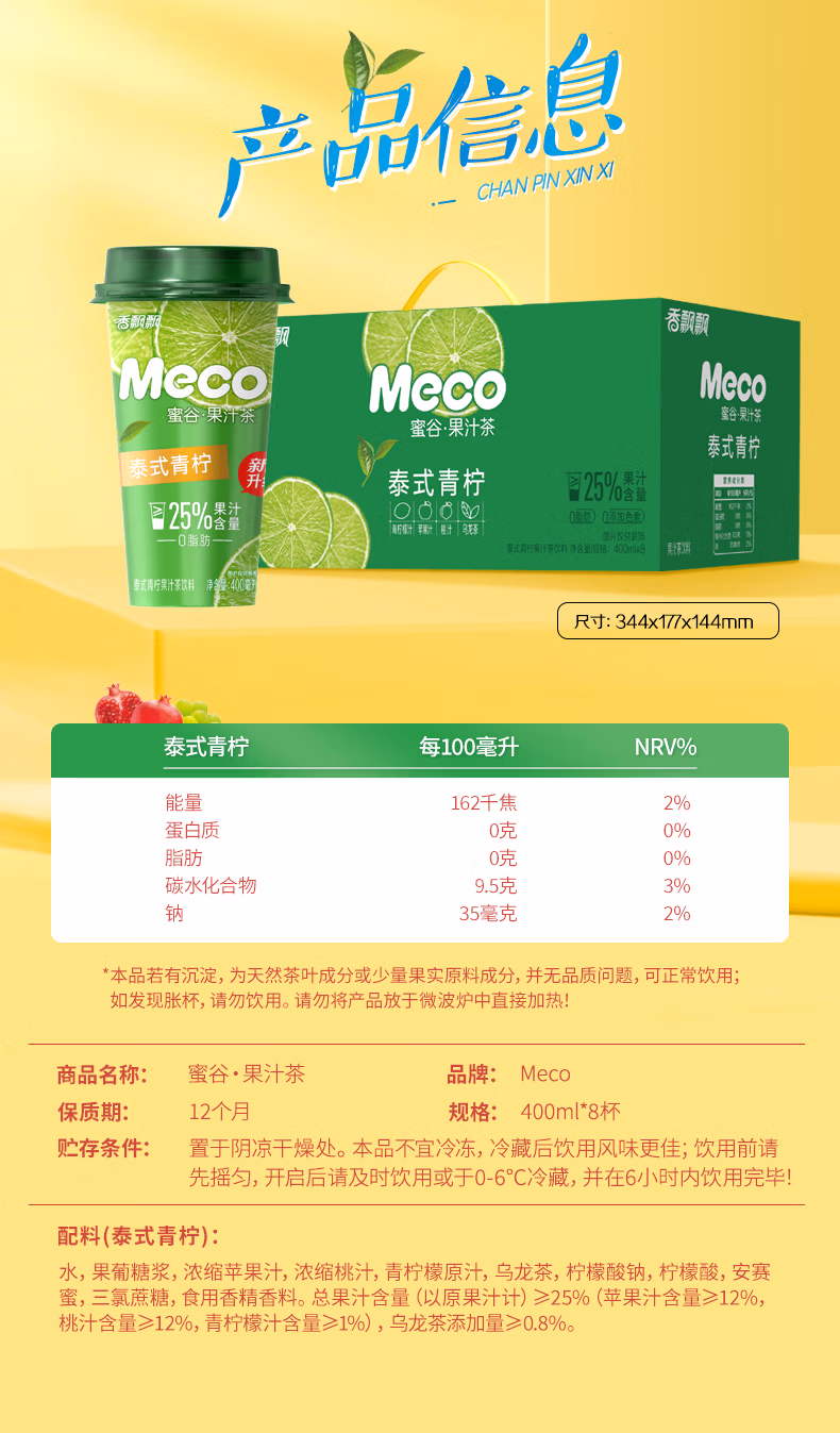 香飘飘奶茶 新升级Meco蜜谷果汁茶 泰式青柠口味400ml 15杯