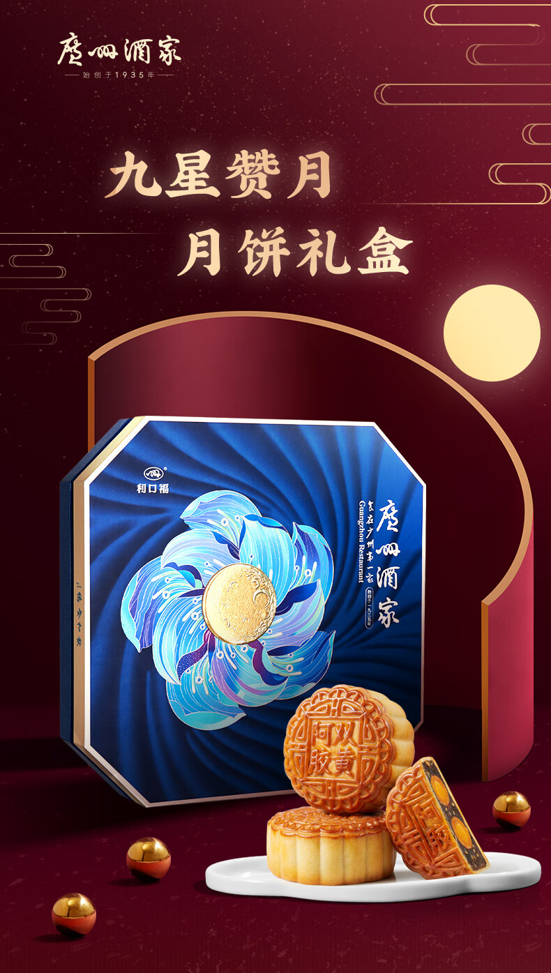 广州酒家七星伴月心意版礼盒双黄纯白蛋黄豆沙五仁广式月饼 九星赞月1080g【9饼5味】 礼盒装