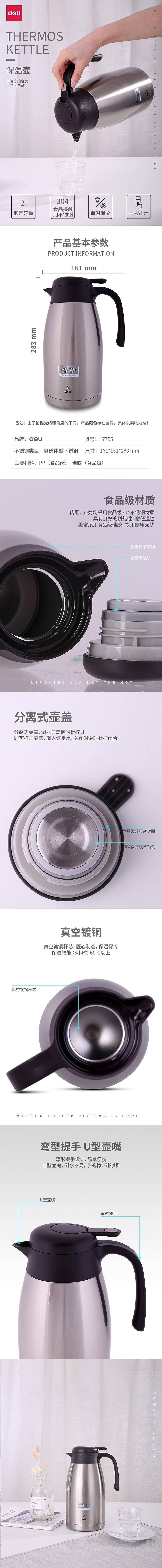 得力 17755 不锈钢真空保温壶 2L 本色(单位:个)